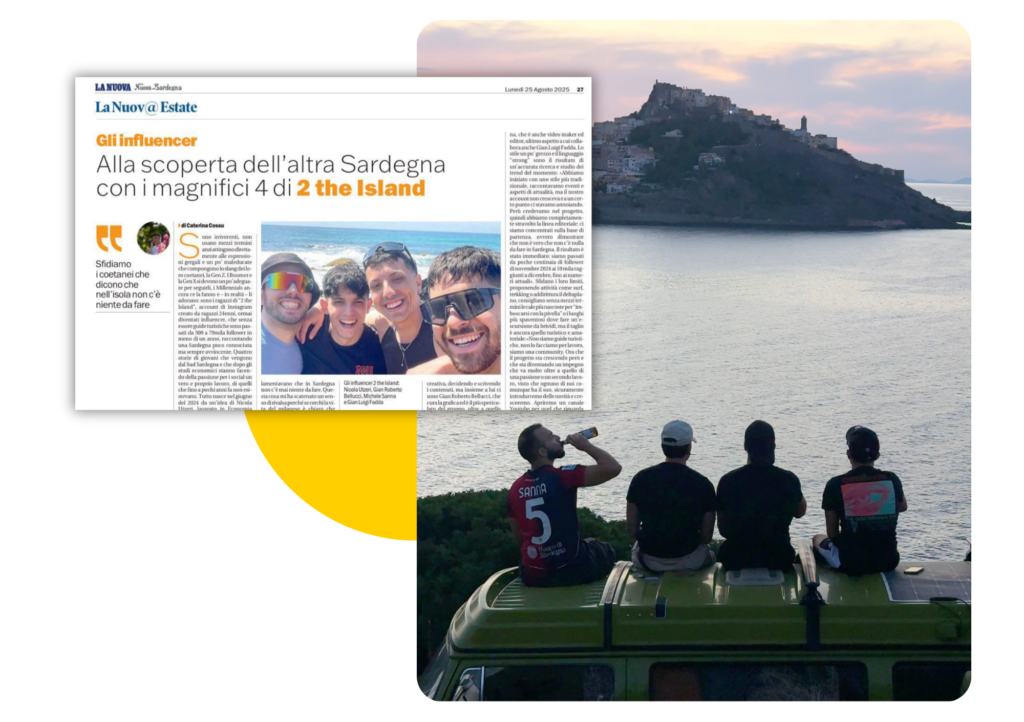 Siamo 4 ragazzi che vivono l’isola in prima persona e la raccontano con uno stile diretto, spontaneo e riconoscibile. Nel tempo siamo diventati un punto di riferimento per chi vuole scoprire cosa fare, dove andare e quali esperienze vivere in Sardegna — ma soprattutto come viverle